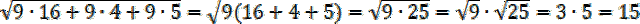 W wyrażeniu pod pierwiastkiem wyłącz największy wspólny czynnik przed nawias. Zapisz wyrażenie pod pierwiastkiem jako iloczyn dwóch liczb, następnie zamień na iloczyn dwóch pierwiastków i oblicz.