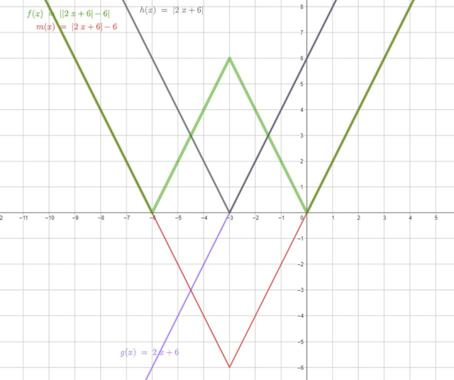 Krok 2: obłóż funkcję liniową wartością bezwzględną (czyli odbij symetrycznie względem osi x tą część wykresu, która znajduje się pod osią x).