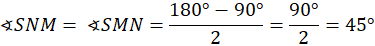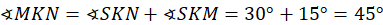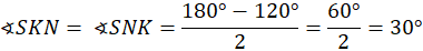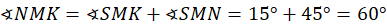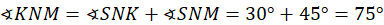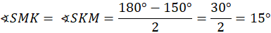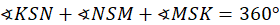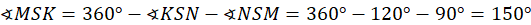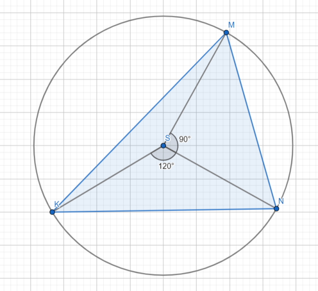 Zauważ, że wszystkie promienie w okręgu są równej długości, więc trójkąty MKS, NMS, KNS są trójkątami równoramiennymi. Korzystając z sumy kątów w trójkącie, oblicz miary pozostałych kątów w tych trójkątach. Aby poznać miarę kąta rozwartego w trójkącie MKS, skorzystaj z miary kąta pełnego. Dodaj do siebie odpowiednie kąty ostre w trójkątach rozwartokątnych, aby otrzymać miary kątów trójkąta KMN.