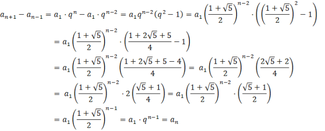 Zadanie rozwiązujesz, korzystając z własności ciągów oraz działań na potęgach. Jeśli masz wyraz , to sąsiadujące z nim wyrazy to: oraz . Z własności ciągu geometrycznego wiadomo, że . Tutaj masz udowodnić, że tą samą wartość uzyskasz odejmując od siebie sąsiednie wyrazy danego ciągu. Zapisujesz więc lewą stronę równania, uwzględniając iloraz ciągu, czyli zapisując oraz . Podkładasz pod jego konkretną wartość i wykonujesz działania na potęgach oraz wykorzystujesz wzór skróconego mnożenia. Po doprowadzeniu równości do prostszej postaci zauważ, że wartość uzyskana w nawiasie to iloraz ciągu, a finalny wynik to równanie wyrazu .