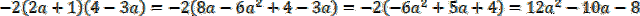 Wykonaj mnożenie nawiasów. Przemnóż wszystkie elementy z pierwszego nawiasu przez wszystkie elementy z drugiego nawiasu, a następnie całe wyrażenie pomnóż przez (-2) i doprowadź wyrażenie do najprostszej postaci.