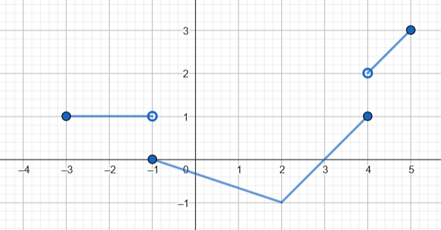 Narysuj wykres przykładowej funkcji spełniającej podane warunki. Dziedziną funkcji jest przedział , zbiorem wartości jest przedział , miejscami zerowymi funkcji są liczby: -1 i 3.