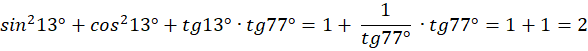 Zauważ, że pierwsza część wyrażenia to jedynka trygonometryczna. W drugiej części zastosuj zależność
