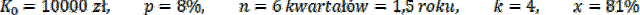 Ustal, ile zarobi pan Nowak na tej lokacie po 6 kwartałach. W obliczeniach uwzględnij 19-procentowy podatek od dochodów kapitałowych, jeśli założył w banku lokatę w wysokości 10 000 zł na procent składany z kwartalną kapitalizacją odsetek. Roczne oprocentowanie tej lokaty wynosi 8% i się nie zmienia.