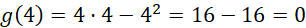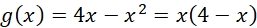 W przypadku funkcji kwadratowej narysuj parabolę przecinającą oś x w punktach 0 i 4, z ramionami skierowanymi w dół i której wierzchołek leży w punkcie o współrzędnych (2, 4).