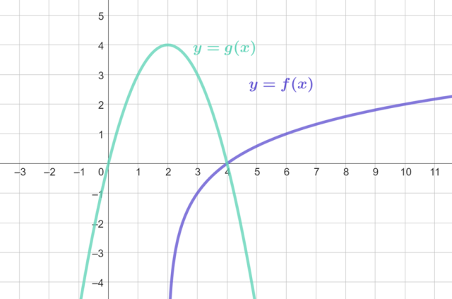 Odczytaj rozwiązanie nierówności, czyli argumenty, dla których wykres funkcji f leży powyżej lub pokrywa się z wykresem funkcji g.