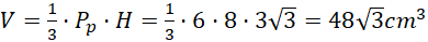 Zwróć uwagę, że trójkąt, w którym zawiera się wysokość ostrosłupa, jest trójkątem równobocznym. Oblicz objętość jako jedną trzecią pola prostokątnej podstawy i wysokości.