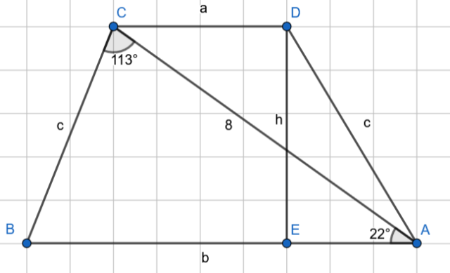 Wyznacz miary kątów i długości boków trapezu z dokładnością do dwóch miejsc po przecinku, jeśli w trapezie równoramiennym ABCD, w którym , przekątna AC ma długość 8 cm, i .