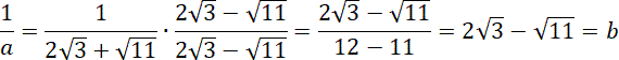 Znajdź odwrotność liczby a, usuń niewymierność z mianownika i sprawdź czy uzyskany wynik jest równy wartości liczby b.