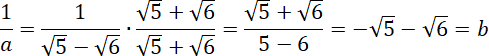 Znajdź odwrotność liczby a, usuń niewymierność z mianownika i sprawdź czy uzyskany wynik jest równy wartości liczby b.