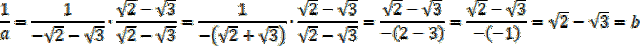 Znajdź odwrotność liczby a, usuń niewymierność z mianownika i sprawdź czy uzyskany wynik jest równy wartości liczby b.