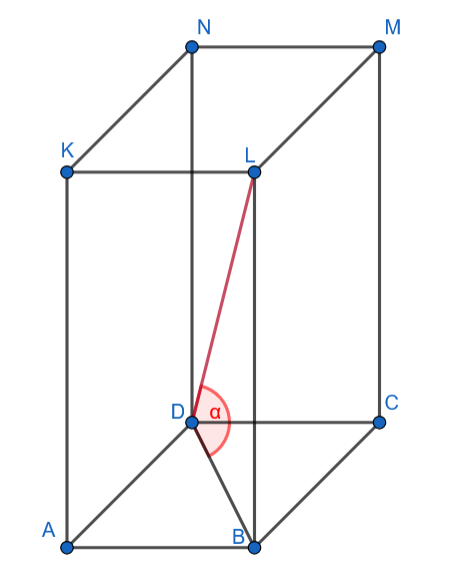 Narysuj rzut prostopadłościanu ABCDKLMN. Zaznacz na rysunku kąty nachylenia przekątnej DL do płaszczyzny podstawy ABCD.