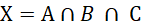 Zaznaczony graficznie zbiór X jest częścią wspólną ze zbiorów A, B oraz C.