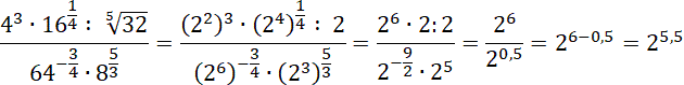 Najpierw zamień wszystkie czynniki w mianowniku i liczniku na liczby w postaci potęgi liczby 2, następnie wykonaj obliczenia. Aby tego dokonać, zastosuj prawa działań na potęgach: