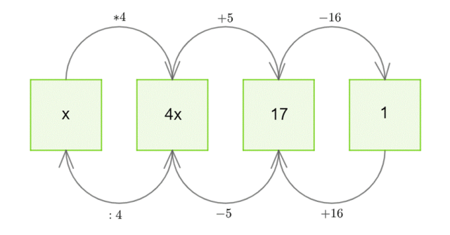 Zacznijmy od wypisania podanego równania na grafie: w pierwszym polu musi znaleźć się nasza niewiadoma, została ona powiększona czterokrotnie, więc nad pierwszą strzałką umieść mnożenie, iloczyn powiększono o 5 – nad drugą strzałką znajdzie się dodawanie, otrzymaną liczbę pomniejszono o 16 – zapisz nad trzecią strzałką odejmowanie. W ostatnim polu znajdzie się wynik, czyli liczba 1. Teraz na strzałkach na dole, które prowadzą w drugą stronę, umieść działania odwrotne: odejmowanie zamień na dodawanie, dodawanie – na odejmowanie, a mnożenie to teraz dzielenie. Wykonuj działania w takiej kolejności, w jakiej znajdują się na dolnych strzałkach, a dojdziesz do szukanej liczby.
