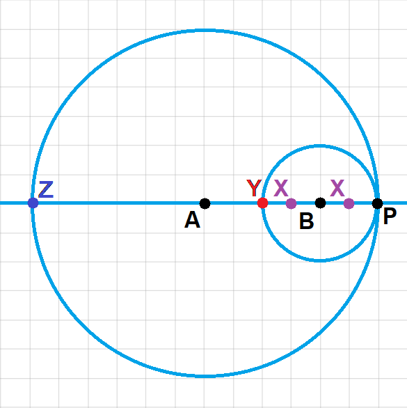 Punkt X leży w odległości 1 cm od punktu B (obojętnie, po której stronie), a więc w odległości mniejszej niż promień – znajduje się wewnątrz koła KB, a więc również wewnątrz koła KA.