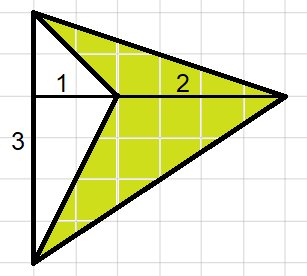 Narysuj trójkąt, który będzie zawierał zieloną figurę tak jak na rysunku. Oblicz pole dużego trójkąta, a następnie pole małego i ich różnicę, która będzie równa polu zielonej figury.