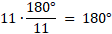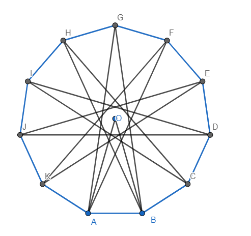W jedenastokącie foremnym narysowano przekątne, łącząc wierzchołki co piąty. Powstał tzw. wielokąt gwieździsty. Oblicz sumę miar wszystkich kątów wypukłych, które są tworzone przez dwie takie przekątne wychodzące z jednego wierzchołka, czyli kąty "promyki gwiazdki".