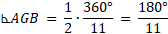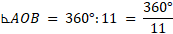 Zacznij od obliczenia miary kąta środkowego AOB. Następnie oblicz miarę kąta jednego z jedenastu promieni gwiazdy. Każdy z tych kątów będzie kątem wpisanym i będzie miał identyczną miarę i będzie oparty na tym samym łuku co kąt środkowy. Miara kąta promienia gwiazdy będzie połową miary kąta środkowego. Oblicz tą miarę i następnie przemnóż przez 11, aby otrzymać sumę miar kątów promieni.