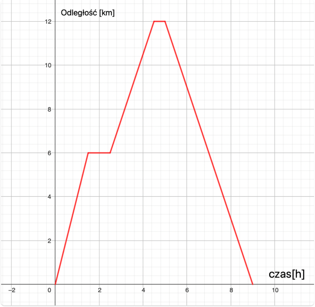 W tym zadaniu musisz narysować wykres przedstawiający zależność odległości turysty od schroniska od czasu, jeżeli turysta wyszedł ze schroniska o godzinie 8.00. Pierwsze 6 km pokonał z prędkością 4 km/h, po czym odpoczywał godzinę. Po kolejnych dwóch godzinach marszu z prędkością 3 km/h turysta osiągnął swój cel i odpoczywał tam pół godziny. Po tym czasie wyruszył z powrotem do schroniska z prędkością 3 km/h.