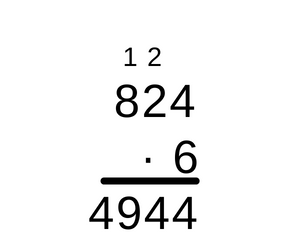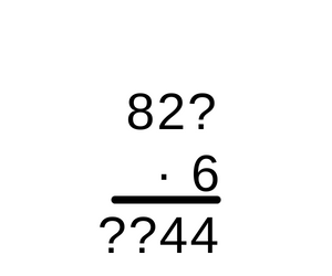 Zauważ, że 6 pomnożono przez cyfrę jedności większej liczby, da na miejscu jedności w wyniku 4, są zatem dwie możliwości, jest to 4 lub 9 zamiast znaku zapytania na miejscu cyfr jedności. Skoro po pomnożeniu 6 i cyfry dziesiątek w wyniku będzie 2, to z poprzedniego mnożeniu musiało przejść 2, dlatego zamiast pierwszego od prawej znaku zapytania należy wpisać 4, ponieważ po pomnożeniu przez 6 da cyfrę dziesiątek równą 2. Z mnożenia 6 przez cyfrę dziesiątek przejdzie jeden dalej. Ostatnim krokiem jest pomnożenie 6 · 8 i dodanie 1, które przeszło dalej, co da w sumie 49.