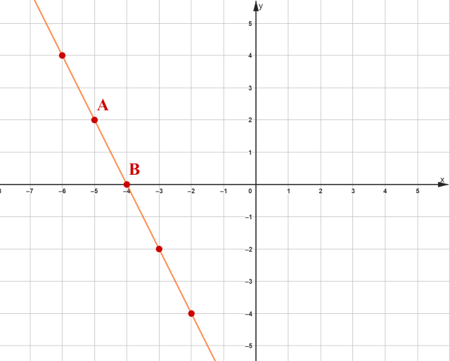 W tym zadaniu musisz zaznaczyć punkty A = ( -5, 2 ), B = ( -4, 0 ) na układzie współrzędnych, następnie podaj współrzędne trzech punktów kratowych leżących na prostej AB.