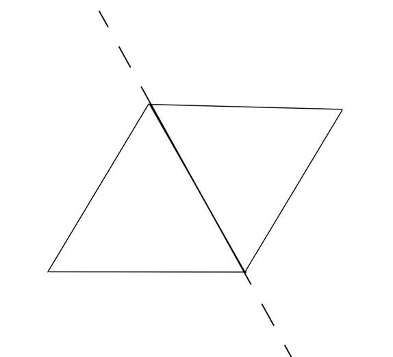 Aby część wspólna trójkąta równobocznego i jego odbicia symetrycznego była czworokątem, poprowadź oś symetrii wzdłuż jednego z boków tego trójkąta. Po odbiciu powstanie trapez.