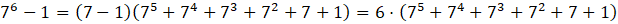 . Pierwszy nawias jest różnicą liczb 7 i 1, która wynosi 6, co daje nam informacje, że liczba jest iloczynem 6 i jakiejś dużej liczby, co oznacza, że jest podzielna przez 6.