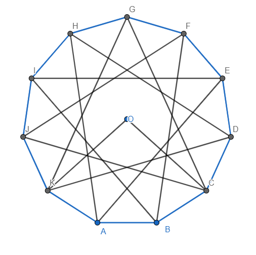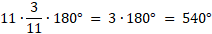 W jedenastokącie foremnym narysowano przekątne, łącząc wierzchołki co czwarty. Powstał tzw. wielokąt gwieździsty. Oblicz sumę miar wszystkich kątów wypukłych, które są tworzone przez dwie takie przekątne wychodzące z jednego wierzchołka, czyli kąty "promyki gwiazdki".