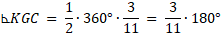 Zacznij od obliczenia miary kąta środkowego KOC. Następnie oblicz miarę kąta wpisanego, opartego na tym samym łuku co kąt KOC. Suma miar kątów promyków gwiazdki będzie składała się z 11 miar takich kątów wpisanych.