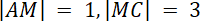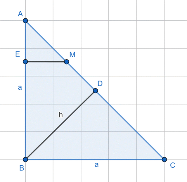 W trójkącie prostokątnym równoramiennym najkrótsza wysokość ma długość 2 cm. Punkt M należy do przeciwprostokątnej tego trójkąta i dzieli ją w stosunku 1:3. W tym zadaniu musisz obliczyć odległości punktu M od przyprostokątnych.