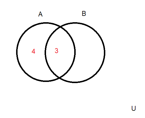 Skoro , to 4 elementy są w części diagramu, która przynależy tylko zbiorowi A. Ponieważ U zawiera 10 elementów, z czego 3 są w A’, to A musi zawierać pozostałych 7 elementów. A więc część wspólna A i B zawiera 3 elementy.