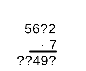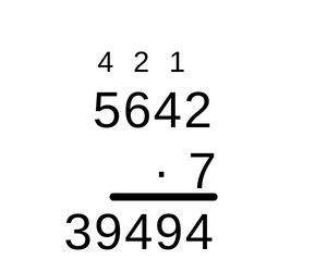 Mnożąc 7 przez cyfrę jedności równą 2, otrzymasz 14 i w wyniku na miejscu jedności będzie 4 i do następnego słupka przejdzie 1. Należy znaleźć teraz liczbę, która po pomnożeniu przez 7 i dodaniu jeden, które przesło będzie miało cyfrę jedności równą 9. Taką liczbą jest 4, ponieważ po pomnożeniu 4 i 7 otrzymasz 28 i do tego jeszcze dodając 1, które przeszło ostatecznie będzie 29. 9 zostanie na miejscu cyfr dziesiątek w wyniku i dwa przejdzie dalej. Potem po pomnożeniu 6 przez 7 i dodaniu 2, które przeszło otrzymasz 44. W wyniku na miejscu setek jest 4 i 4 przejdzie dalej do słupka tysięcy. 7 pomnożone przez 5 da 35, a po dodaniu jeszcze 4, ostatecznym wynikiem będzie 39.