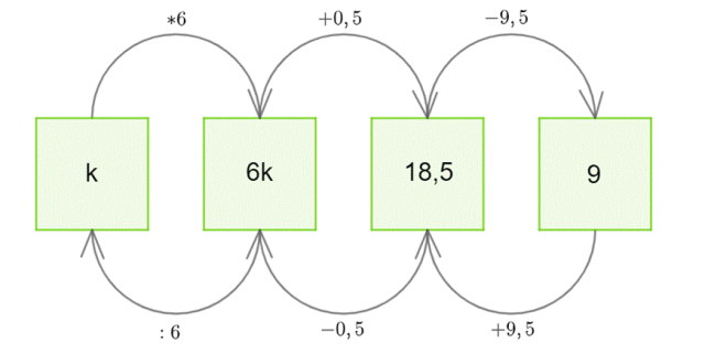 Zacznijmy od wypisania podanego równania na grafie: w pierwszym polu musi znaleźć się nasza niewiadoma, została ona powiększona sześciokrotnie, więc nad pierwszą strzałką umieść mnożenie, iloczyn powiększono o 0,5 – nad drugą strzałką znajdzie się dodawanie, otrzymaną liczbę pomniejszono o 9,5 – zapisz nad trzecią strzałką odejmowanie. W ostatnim polu znajdzie się wynik, czyli liczba 9. Teraz na strzałkach na dole, które prowadzą w drugą stronę, umieść działania odwrotne: odejmowanie zamień na dodawanie, dodawanie – na odejmowanie, a mnożenie to teraz dzielenie. Wykonuj działania w takiej kolejności, w jakiej znajdują się na dolnych strzałkach, a dojdziesz do szukanej liczby.