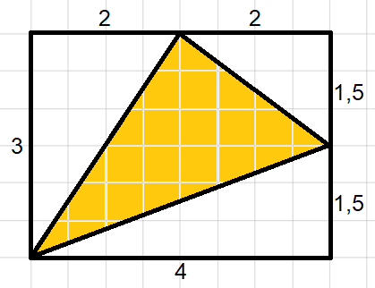 Narysuj prostokąt, który będzie zawierał pomarańczową figurę tak jak na rysunku. Oblicz pole prostokąta, a następnie pola białych trójkątów. Pole pomarańczowej figury będzie różnicą pola prostokąta i pól trójkątów.