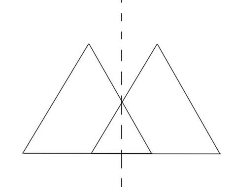 Aby część wspólna trójkąta równobocznego i jego odbicia symetrycznego była pięciokątem, poprowadź oś symetrii prostopadle do jednego z boków tego trójkąta, jednak nie wzdłuż jego wysokości. Bliższy osi wierzchołek z tych przy prostopadłym do osi boku tego trójkąta nie zostanie wierzchołkiem pięciokąta.