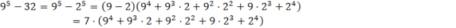 . Pierwszy nawias jest różnicą liczb 9 i 2, która wynosi 7, co daje nam informacje, że liczba jest iloczynem 7 i jakiejś dużej liczby, co oznacza, że jest podzielna przez 7.