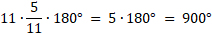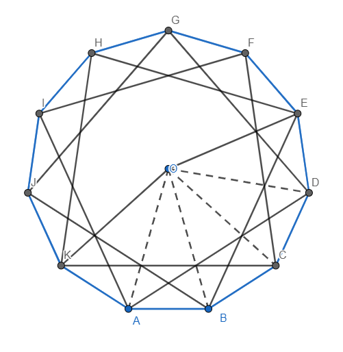 W jedenastokącie foremnym narysowano przekątne, łącząc wierzchołki co trzeci. Powstał tzw. wielokąt gwieździsty. Oblicz sumę miar wszystkich kątów wypukłych, które są tworzone przez dwie takie przekątne wychodzące z jednego wierzchołka, czyli kąty "promyki gwiazdki".