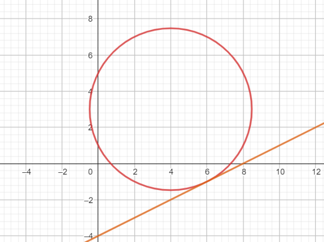 Interpretacją graficzną układu jest okrąg reprezentujący pierwsze równanie i prosta reprezentująca drugie równanie. Ponieważ prosta jest styczna do okręgu, równanie ma tylko jedno rozwiązanie.