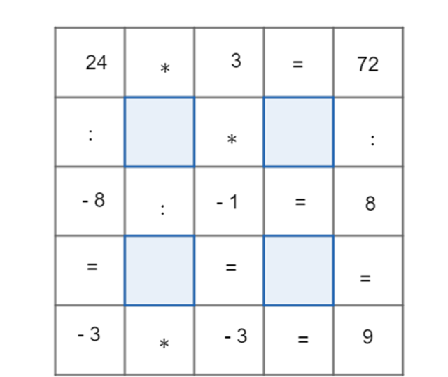 Znajdź miejsce, gdzie brakuje jedynie jednej liczby i uzupełnij je. Postępuj tak, aż wypełnisz całą krzyżówkę. Pamiętaj, iloczyn lub iloraz dwóch liczb tego samego znaku jest liczbą dodatnią, a iloczyn lub iloraz dwóch liczb różnych znaków jest liczbą ujemną. Wykonuj działania na wartościach bezwzględnych i wstawiaj odpowiednie znaki.