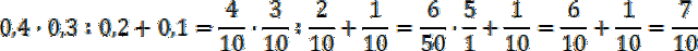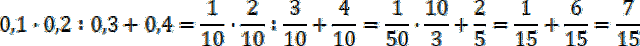 Pamiętaj o kolejności wykonywania działań: najpierw mnożenie i dzielenie, a potem dodawanie i odejmowanie. W przypadku działań o takiej samej ważności wykonuj je od prawej do lewej. Zamień liczby dziesiętne na ułamki zwykłe o mianowniku 10 i skróć je, jeżeli to możliwe. Zamień dzielenie na mnożenie przez odwrotność dzielnika. Przed wykonaniem dodawania sprowadź ułamki do wspólnego mianownika. Wyniki zapisz w najprostszej postaci, czyli wyłącz całości i pozostaw je w nieskracalnej formie.