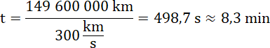 W tym zadaniu musisz skorzystać ze wzoru i obliczyć czas potrzebny promieniowi słonecznemu na dotarcie do Ziemi, znając prędkość światła i dystans do przebycia.
