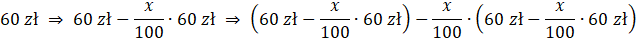 Rozwiązanie zadania zacznij od zapisania zmiany ceny przy każdej obniżce (pamiętaj o wyznaczeniu dziedziny niewiadomej x!). Przyrównaj wartości otrzymane po drugiej obniżce o x% do znanej ceny końcowej, otrzymasz w ten sposób równanie kwadratowe niewiadomej x. Rozwiąż równanie pamiętając by sprawdzić, czy otrzymane pierwiastki należą do dziedziny.