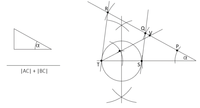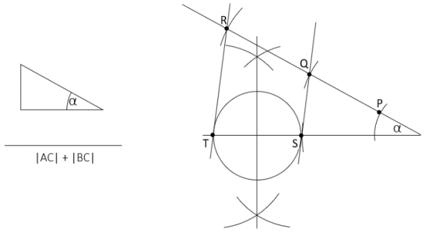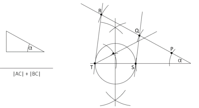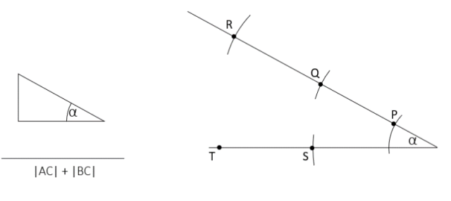Odmierz, a następnie odłóż na drugiej półprostej kolejno przyprostokątne, a następnie przeciwprostokątną trójkąta prostokątnego wyznaczonego w punkcie 1 – zaczynając od punktu najbliżej wierzchołka kąta – oznacz punkty kolejno jako P, Q, R.