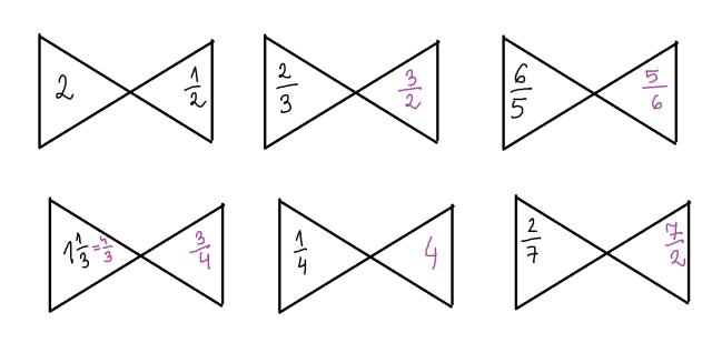Znajdź taką liczbę, która po przemnożeniu przez liczbę w lewej części kokardki da wynik 1.