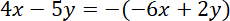 Aby punkty były symetryczne względem początku układów współrzędnych ich współrzędne x oraz y muszą być liczbami przeciwnymi. Rozwiąż równania, aby znaleźć niewiadome. Dane są punkty: K = (4x – 5y, -3y – 2) L = (-6x + 2y, 10 – 5y)