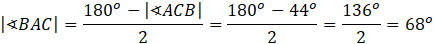 Skoro trójkąt ABC jest równoramienny, to miary jego kątów przy podstawie są równe. Na tej podstawie oblicz miarę kąta BAC. Skorzystaj z tego, że suma miar kątów w trójkącie wynosi
