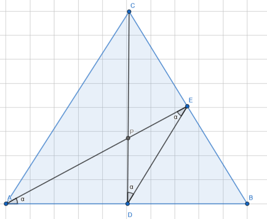 Musisz zauważyć, że trójkąty równoboczne mają równe środkowe i trójkąty ADE oraz EPD mają wspólny kąt przy podstawie.