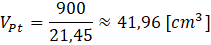 Gdzie d – gęstość, m – masa zaś V to objętość. Ponieważ wzorzec składa się ze stopu dwóch materiałów możesz potraktować go jako dwa obiekty składające się z tych materiałów osobno. Skoro 90% walca stanowi platyna, to stanowi ona 90% jego masy, czyli masa platyny wynosi 0,9 kg = 900 g. Analogicznie masa irydu wynosi 100 g. Zamień wszystkie jednostki na g, gdyż gęstości podane są w g/cm3. Podstawiając dane na temat mas oraz gęstości do wcześniejszego wzoru możesz obliczyć jaką objętość zajmują poszczególne pierwiastki.