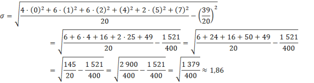 Teraz możesz skorzystać ze wzoru na odchylenie standardowe. Zauważ, że dla kilku takich samych danych będziesz dodawał kilka takich samych kwadratów, więc wystarczy, że przemnożysz je przez ilość ich wystąpień. Lepiej skorzystać tutaj z drugiego wzoru na odchylenie standardowe, aby w rachunkach mieć mniejszą liczbę ułamków.